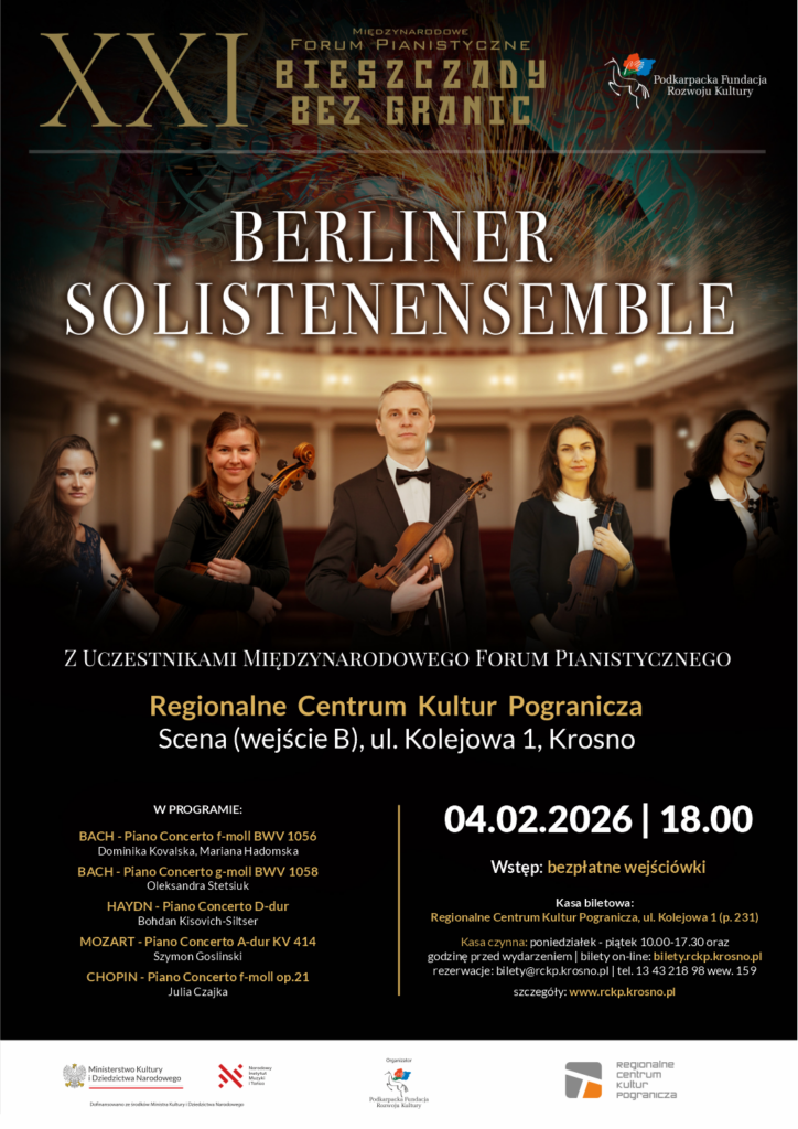 Regionalne Centrum Kultur Pogranicza w Krośnie zaprasza na koncert z udziałem Berliner Solistenensemble – znakomitego zespołu kameralnego, który wystąpi wspólnie z młodymi solistami XXI Międzynarodowego Forum Pianistycznego „Bieszczady bez granic”. Wydarzenie odbędzie się 4 lutego 2026 roku o godz. 18.00 w Krośnie i będzie częścią bogatego programu tegorocznej edycji Forum.