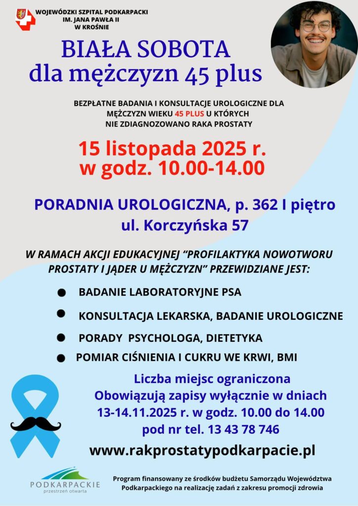 Wojewódzki Szpital Podkarpacki im. Jana Pawła II w Krośnie zaprasza na kolejną edycję akcji profilaktycznej „Biała Sobota dla mężczyzn 45 plus”, która odbędzie się 15 listopada 2025 roku w godz. 10.00–14.00 w Poradni Urologicznej (pok. 362, I piętro) przy ul. Korczyńskiej 57.