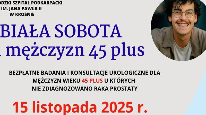 Wojewódzki Szpital Podkarpacki im. Jana Pawła II w Krośnie zaprasza na kolejną edycję akcji profilaktycznej „Biała Sobota dla mężczyzn 45 plus”, która odbędzie się 15 listopada 2025 roku w godz. 10.00–14.00 w Poradni Urologicznej (pok. 362, I piętro) przy ul. Korczyńskiej 57.