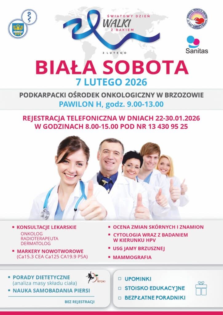 Z okazji Światowego Dnia Walki z Rakiem Podkarpacki Ośrodek Onkologiczny w Brzozowie zaprasza mieszkańców regionu na Białą Sobotę. Akcja profilaktyczna odbędzie się 7 lutego 2026 roku w Pawilonie H, w godzinach 9.00–13.00. Uczestnicy będą mogli skorzystać z szerokiego pakietu bezpłatnych badań, konsultacji specjalistycznych oraz działań edukacyjnych.