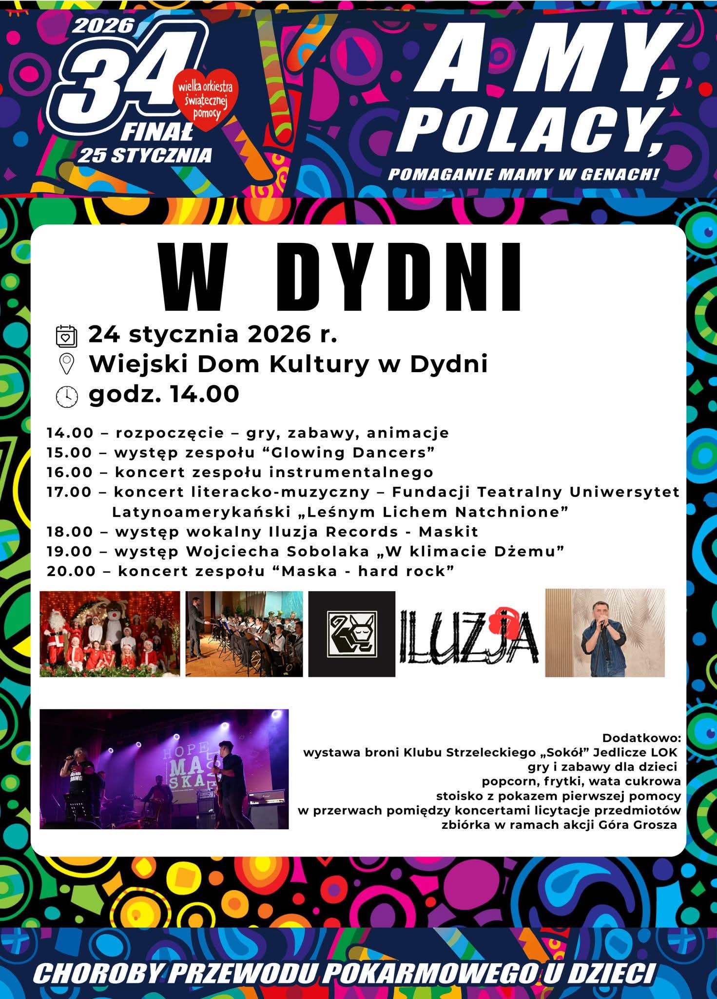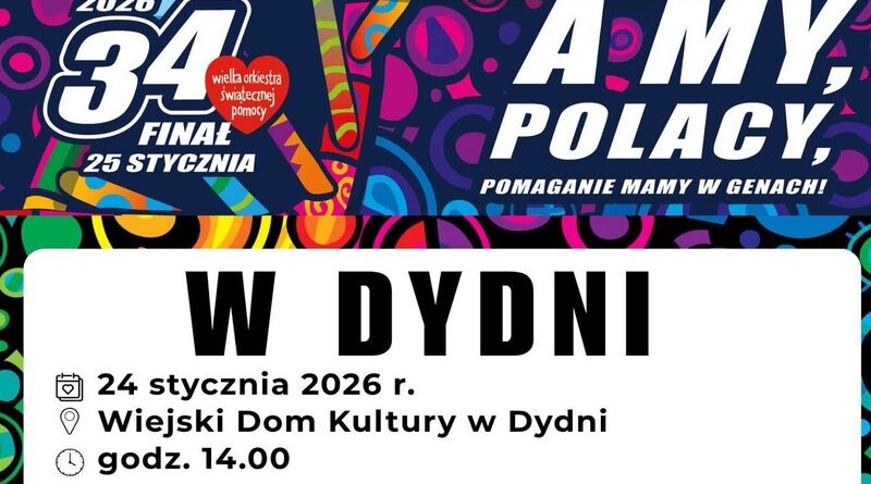Już 24 stycznia Dydnia zagra razem z Wielką Orkiestrą Świątecznej Pomocy. W imieniu organizatorów zapraszamy mieszkańców regionu na finał WOŚP, który rozpocznie się o godz. 14.00 w Wiejskim Domu Kultury w Dydni. Na uczestników czeka bogaty program artystyczny, atrakcje dla całych rodzin oraz liczne licytacje, z których dochód wesprze cel tegorocznej zbiórki.
