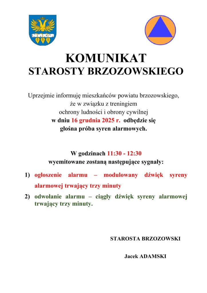 Mieszkańcy powiatu brzozowskiego powinni przygotować się dzisiaj na głośne sygnały alarmowe. We wtorek, 16 grudnia 2025 roku, w godzinach 11.30–12.30 na terenie powiatu przeprowadzona zostanie próba syren alarmowych. Działania te odbędą się w ramach planowego treningu ochrony ludności i obrony cywilnej.