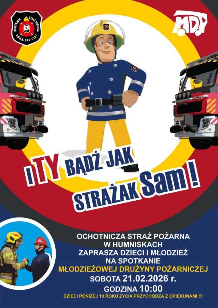 Spotkanie odbędzie się w sobotę, 21 lutego 2026 roku, o godz. 10.00. Pod hasłem „I Ty bądź jak strażak Sam!”. Druhowie zachęcają do aktywnego spędzania czasu, zdobywania wiedzy z zakresu bezpieczeństwa oraz rozwijania zainteresowań związanych z działalnością strażacką. Uczestnicy dowiedzą się, jak przebiega szkolenie w MDP i jakie umiejętności mogą zdobyć jako członkowie drużyny.