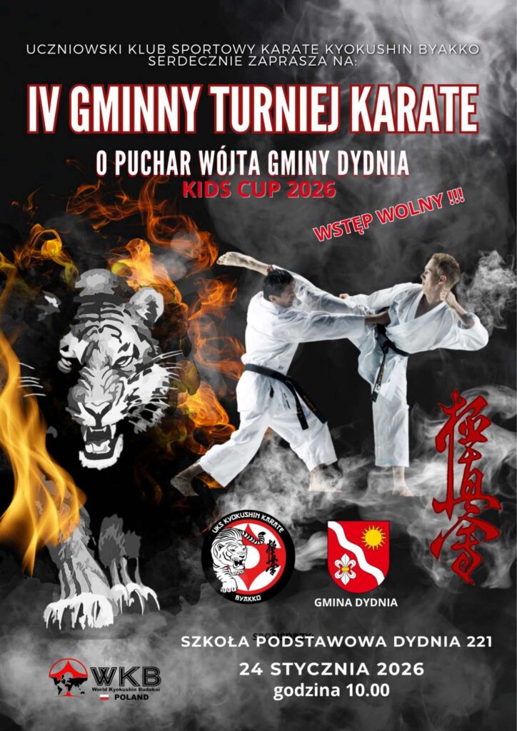 Uczniowski Klub Sportowy Karate Kyokushin “Byakko” zaprasza 24 stycznia 2026 roku do Szkoły Podstawowej w Dydni na IV Gminny Turniej Karate o Puchar Wójta Gminy Dydnia – KIDS CUP 2026. Początek rywalizacji zaplanowano na godzinę 10.00.