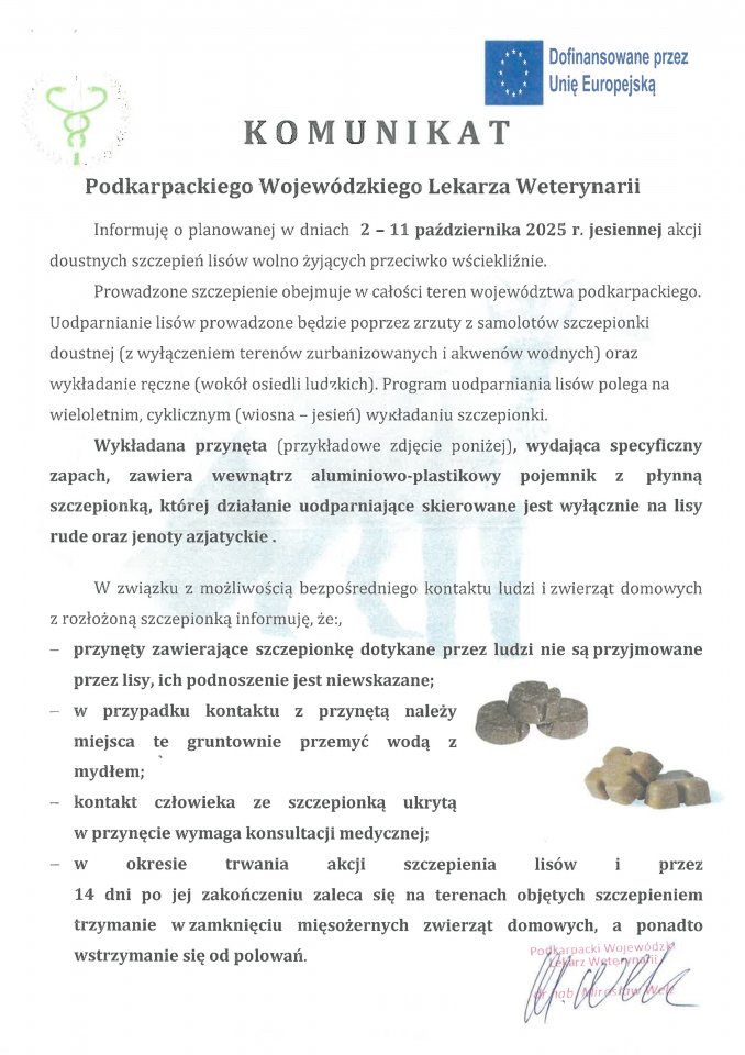 W dniach od 2 do 11 października 2025 roku na terenie całego województwa podkarpackiego zaplanowano jesienną akcję doustnych szczepień lisów wolno żyjących przeciwko wściekliźnie.