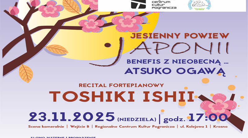 Regionalne Centrum Kultur Pogranicza w Krośnie zaprasza 23 listopada 2025 roku o godzinie 17.00 na Jesienny Powiew Japonii. Wydarzenie przypomni, jak blisko siebie mogą być odległe kultury, gdy łączy je sztuka. Wieczór muzyczny „Benefis z Nieobecną… Atsuko Ogawą” poświęcony będzie pamięci wybitnej japońskiej pianistki. W programie znajdzie się recital fortepianowy Toshikiego Ishii, znakomitego artysty z Japonii. Pianista zaprezentuje repertuar, w którym spotykają się klasyczne dzieła europejskie i współczesne kompozycje japońskie. Jego interpretacje łączą precyzję techniczną z głębokim wyczuciem nastroju i formy. Wieczór ten stanie się propozycją dla wszystkich, którzy cenią muzykę pełną harmonii, refleksji i subtelności.