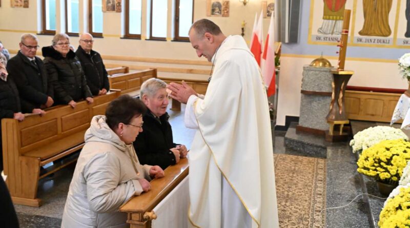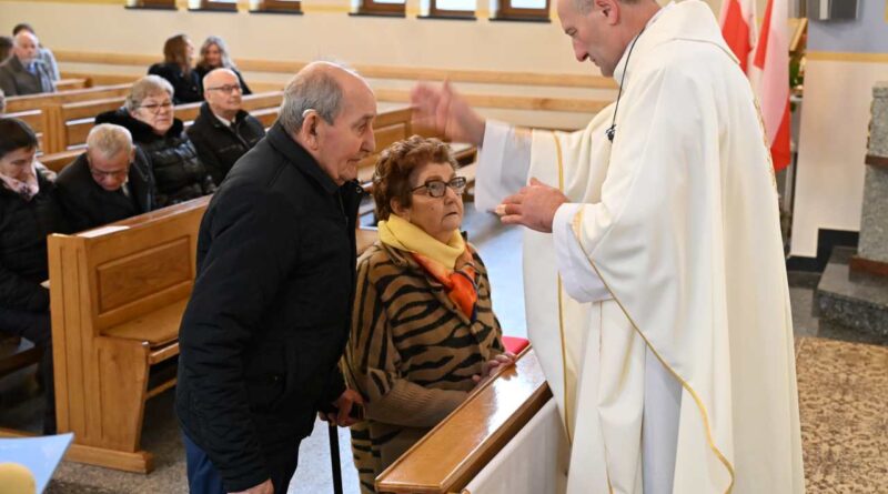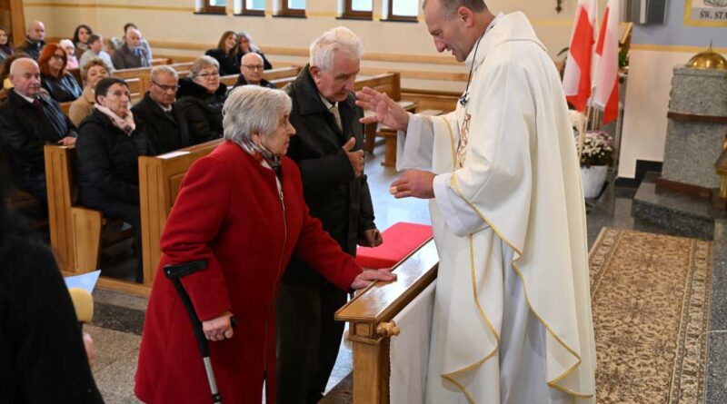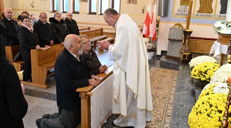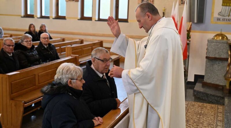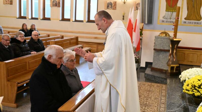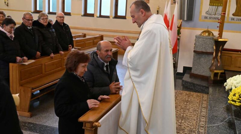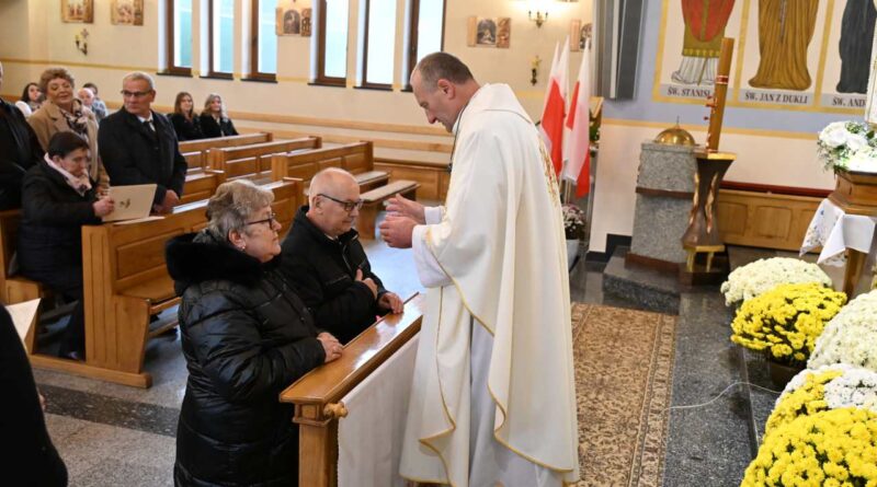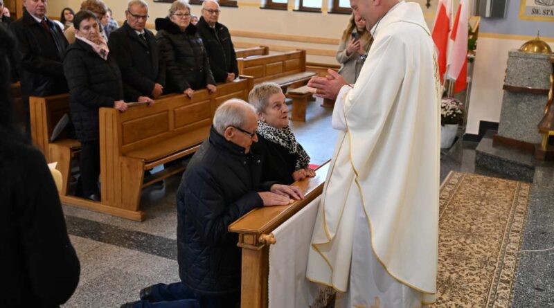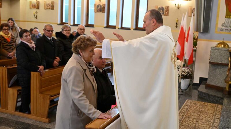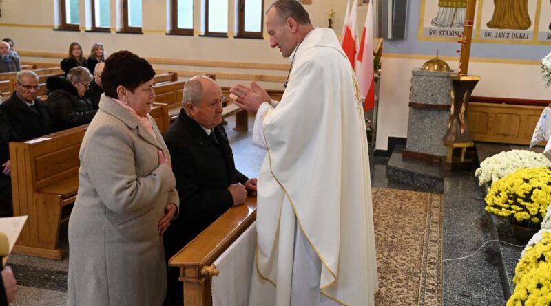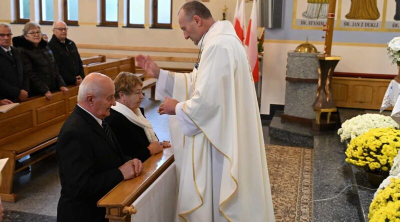 Uroczystość rozpoczęła się mszą św. w kościele parafialnym pw. św. Jana Kantego pod przewodnictwem ks. proboszcza Andrzeja Szkoły, który w ujmującej homilii podkreślił znaczenie małżeństwa, miłości, trwałości związku opartego na łasce wiary i podziękował jubilatom za pielęgnowanie wartości chrześcijańskich. Pogratulował pięknej rocznicy, udzielił błogosławieństwa Bożego na dalsze lata. Podczas mszy św. małżonkowie odnowili przysięgę, a od księdza proboszcza otrzymali różańce i dyplomy.