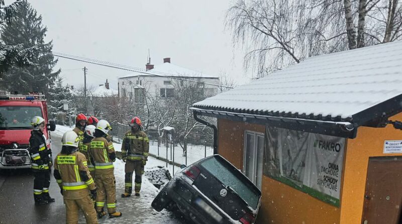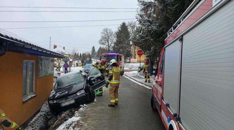 Po przybyciu na miejsce strażacy zastali samochód osobowy, który wpadł do przydrożnego rowu, a następnie uderzył w budynek znajdujący się w pobliżu jezdni.