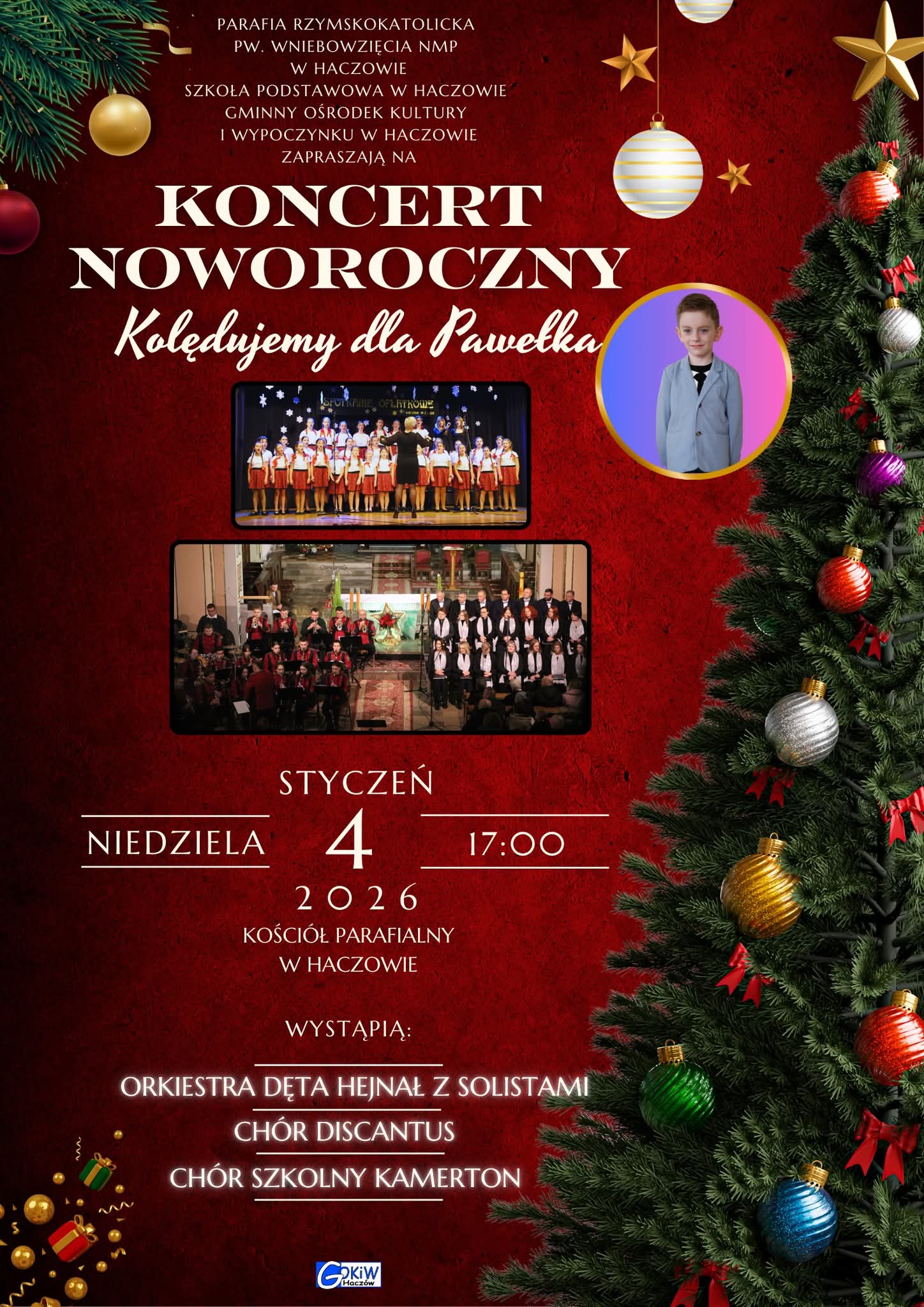 W sobotę, 4 stycznia, o godzinie 17.00 w kościele parafialnym w Haczowie odbędzie się Koncert Noworoczny „Kolędujemy dla…”. Wydarzenie będzie miało charakter charytatywny – podczas koncertu prowadzona będzie zbiórka środków na leczenie 5-letniego Pawełka Witka, mieszkańca Haczowa, chorującego na nieuleczalną wadę serca.