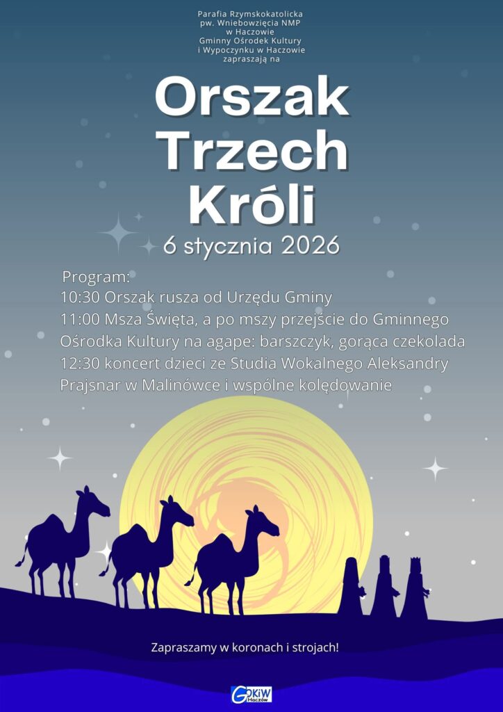 Z kolei w poniedziałek, 6 stycznia, mieszkańcy Haczowa i okolic zaproszeni są do udziału w Orszaku Trzech Króli. Uroczysty pochód wyruszy o godzinie 10.30 spod Urzędu Gminy w Haczowie, skąd uczestnicy udadzą się na Mszę Świętą w kościele parafialnym. Po nabożeństwie orszak przejdzie do Gminnego Ośrodka Kultury i Wypoczynku w Haczowie.