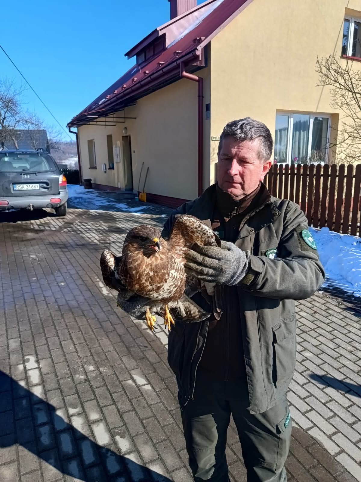 Podczas rutynowego odśnieżania leśnej drogi w miniony poniedziałek pracownicy Zakładu Usług Leśnych wspólnie z leśniczym Nadleśnictwa Brzozów, Lesławem, natrafili pod tarninami na nieruchomego ptaka. Okazało się, że to myszołów – wyziębiony i skrajnie osłabiony, niezdolny do lotu.