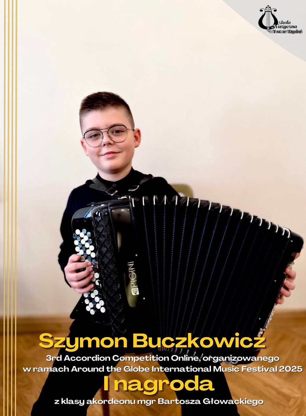 Szymon Buczkowicz, uczeń klasy akordeonu prowadzonej przez Bartosza Głowackiego, zdobył I nagrodę w kategorii Short Recital – Junior (do 12 lat) podczas 3rd Accordion Competition Online, organizowanego w ramach Around the Globe International Music Festival 2025.