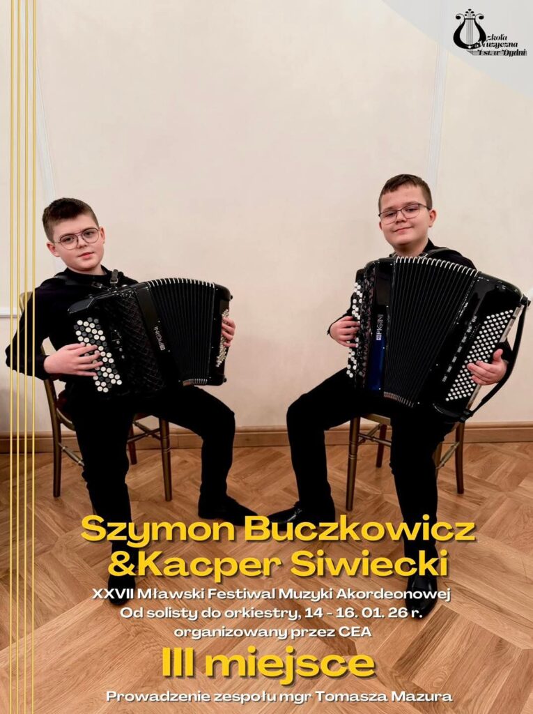 Szymon Buczkowicz oraz Kacper Siwiecki, uczniowie Szkoły Muzycznej I stopnia w Dydni, zdobyli III miejsce w kategorii ZESPOŁY I stopnia podczas XXVII Mławskiego Festiwalu Muzyki Akordeonowej „Od solisty do orkiestry”. Wydarzenie odbyło się w dniach 14–16 stycznia 2026 roku i zostało zorganizowane przez Centrum Edukacji Artystycznej.