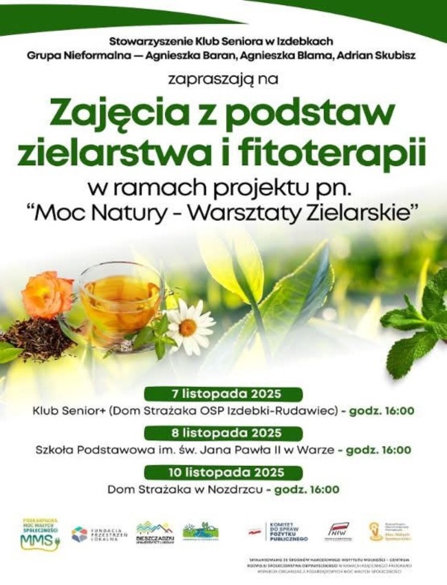 Stowarzyszenie Klub Seniora w Izdebkach wraz z Grupą Nieformalną (Agnieszka Baran, Agnieszka Blama, Adrian Skubisz) serdecznie zapraszają na cykl bezpłatnych warsztatów „Moc Natury — Warsztaty Zielarskie”.