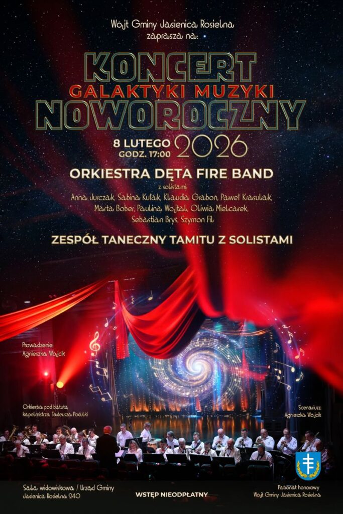 Już 8 lutego 2026 roku o godz. 17.00 sala widowiskowa Urzędu Gminy w Jasienicy Rosielnej zamieni się w muzyczną przestrzeń rodem z kosmosu. Wszystko za sprawą Koncertu Noworocznego 2026 Galaktyki Muzyki, na który zaprasza Wójt Gminy Jasienica Rosielna.