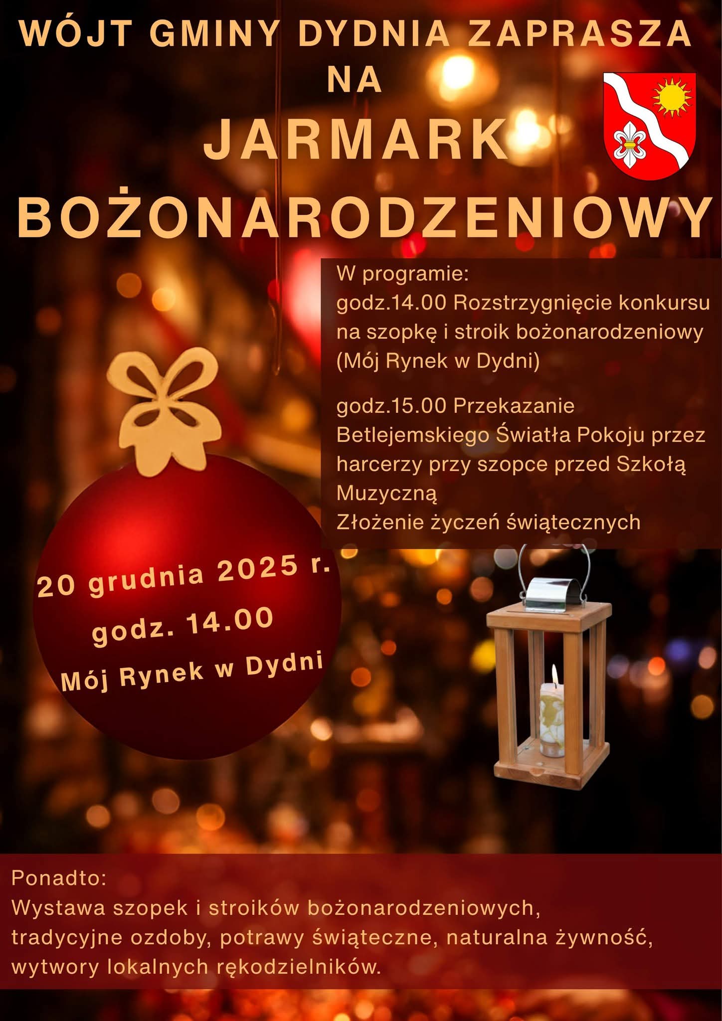 Świąteczna atmosfera coraz bardziej daje o sobie znać, a mieszkańcy gminy Dydnia już wkrótce będą mogli poczuć jej pełen urok. Wójt Gminy Dydnia zaprasza wszystkich mieszkańców oraz gości na Jarmark Bożonarodzeniowy, który odbędzie się 20 grudnia na gminnym targowisku „Mój Rynek”. Początek wydarzenia zaplanowano na godz. 14.00.
