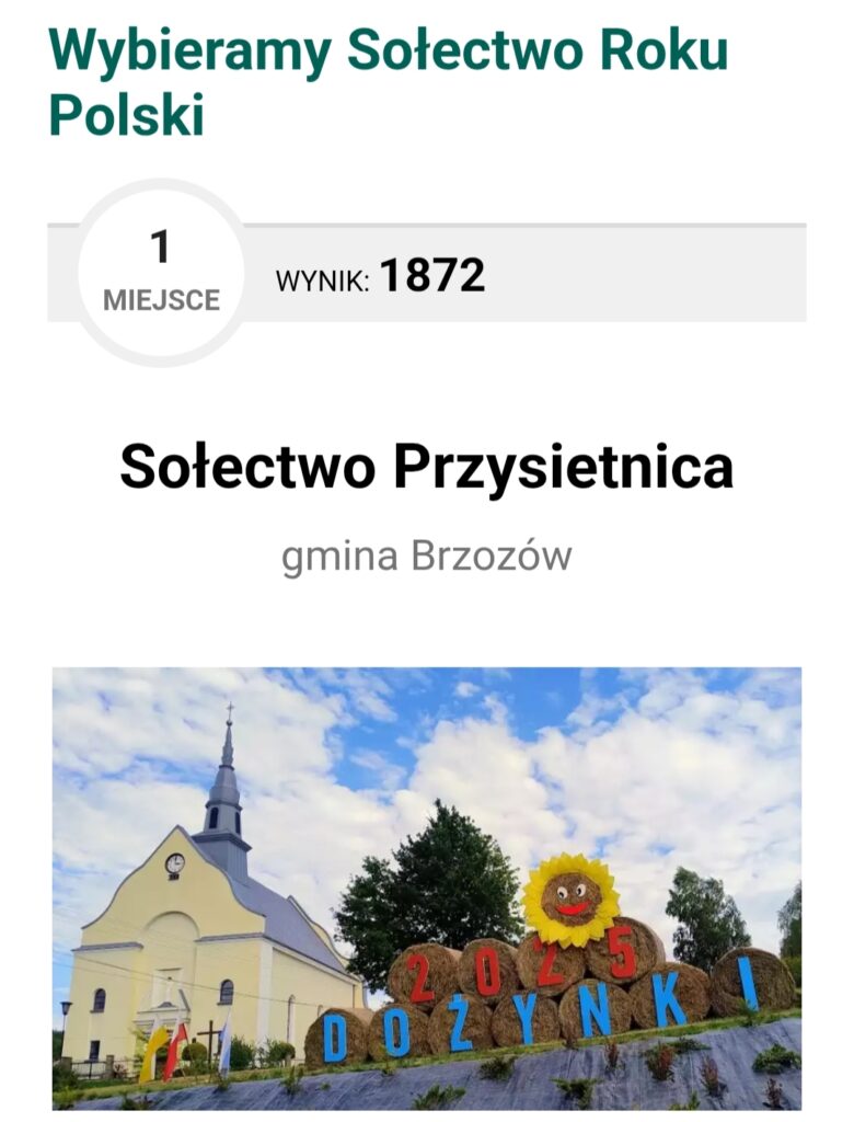 Sołectwo Przysietnica (gmina Brzozów) odniosło spektakularny sukces, zdobywając 1. miejsce w ogólnopolskim plebiscycie „Wybieramy Sołectwo Roku Polski” w ramach konkursu Mistrzowie Agro 2025. Zwycięstwo z wynikiem 1872 głosów zapewniło Przysietnicy prestiżowy tytuł Sołectwo Roku Polski 2025.