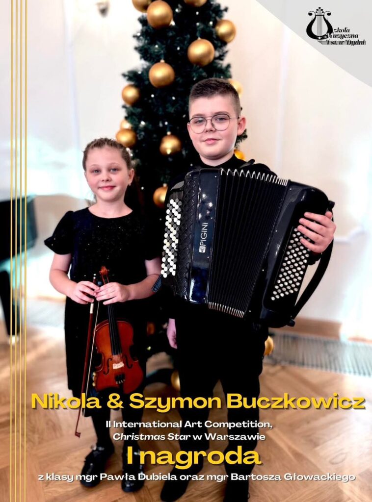 Nikola i Szymon Buczkowicz odnieśli kolejny znaczący sukces artystyczny. Młodzi muzycy zdobyli I nagrodę w II International Art Competition „Christmas Star”, który odbył się w Warszawie. Ich występ został najwyżej oceniony przez międzynarodowe jury, co stanowi potwierdzenie wysokiego poziomu artystycznego oraz systematycznej pracy.
