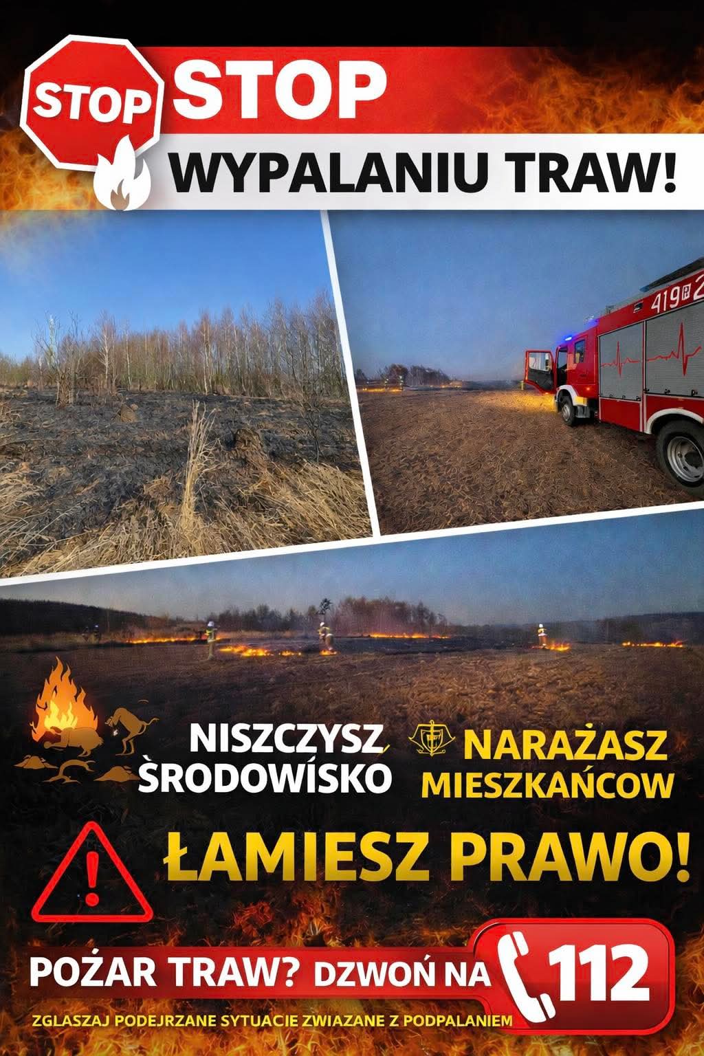 Strażacy podkreślają, że za wypalanie traw grożą surowe konsekwencje. Sprawcy muszą liczyć się z wysokimi karami finansowymi, a w niektórych przypadkach także z odpowiedzialnością karną.