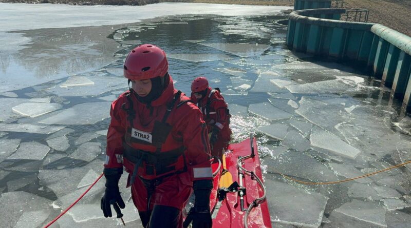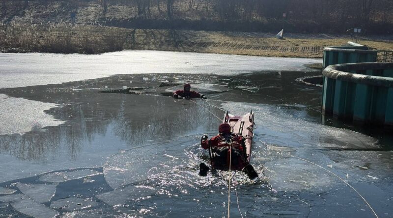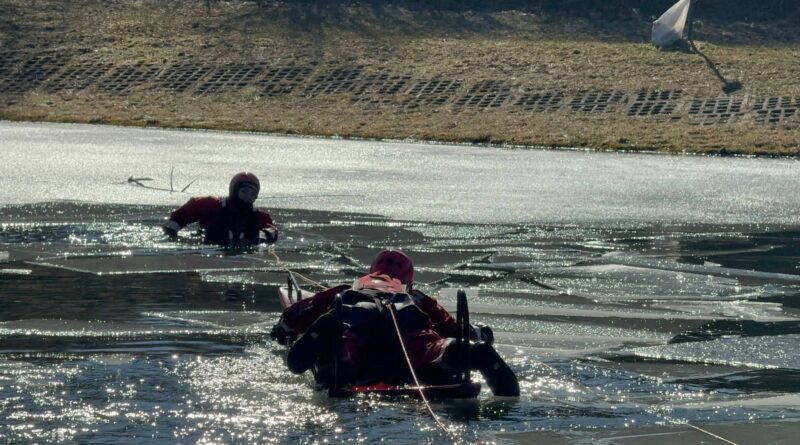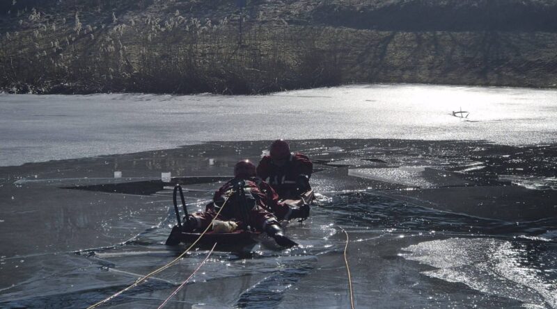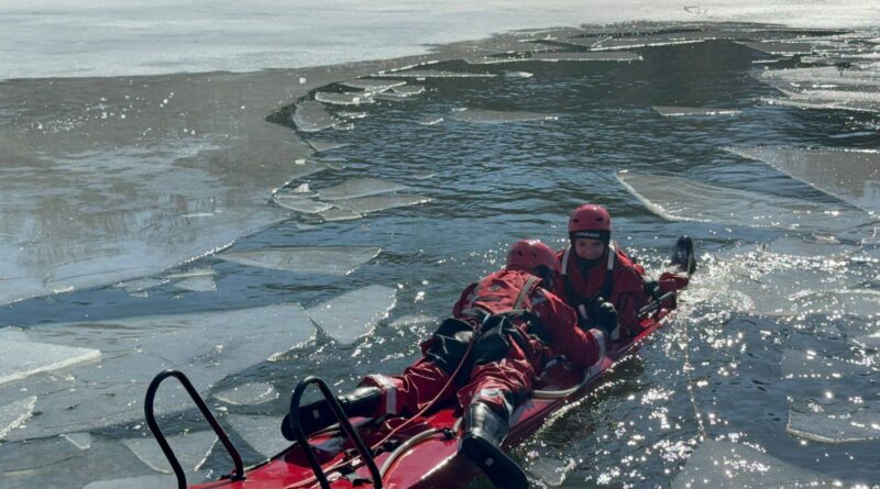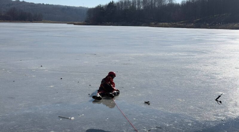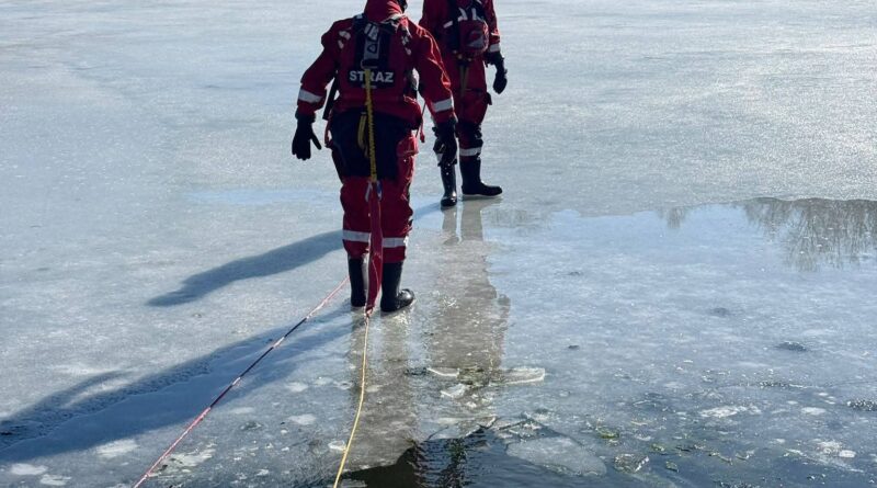 Strażacy ćwiczyli ratownictwo na lodzie. Symulowali akcję po załamaniu się tafli