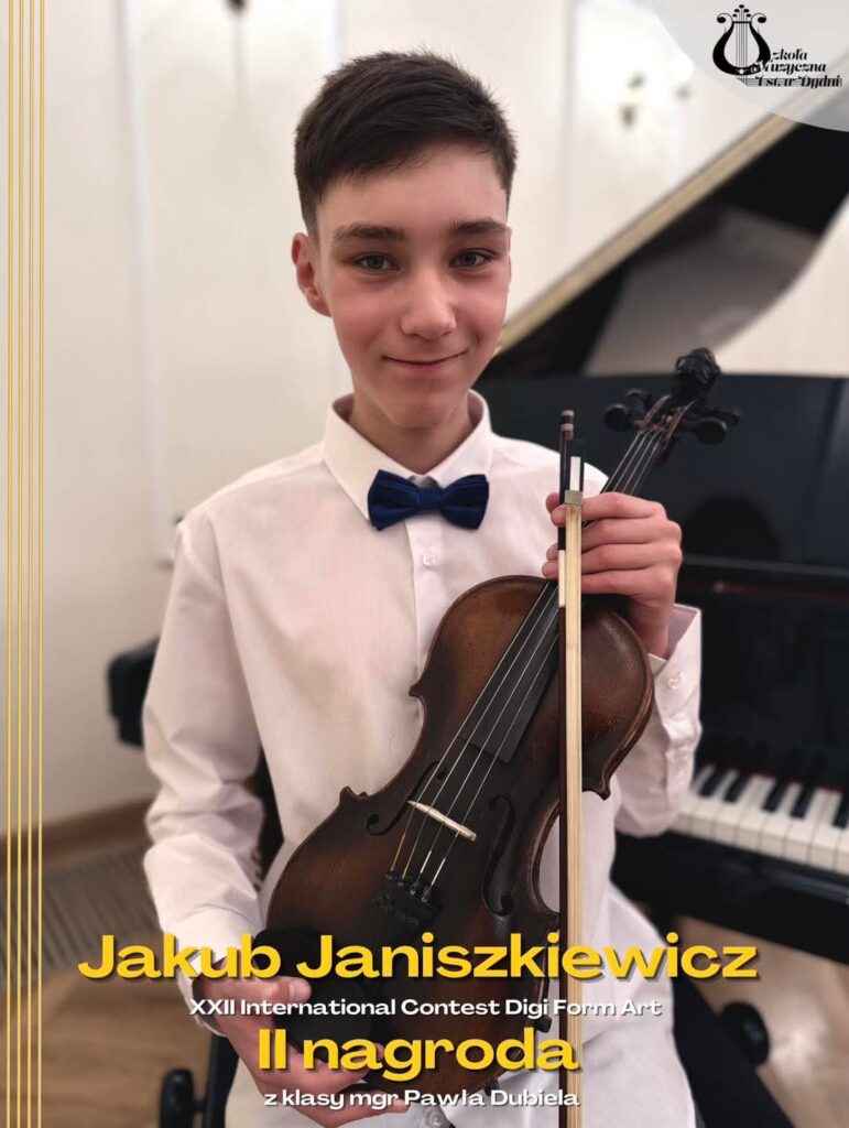 Jakub Janiszkiewicz, uczeń Szkoły Muzycznej I stopnia w Dydni, zdobył II nagrodę w XXII International Contest Digi Form Art. Młody skrzypek kształci się w klasie skrzypiec prowadzonej przez Pawła Dubiela.
