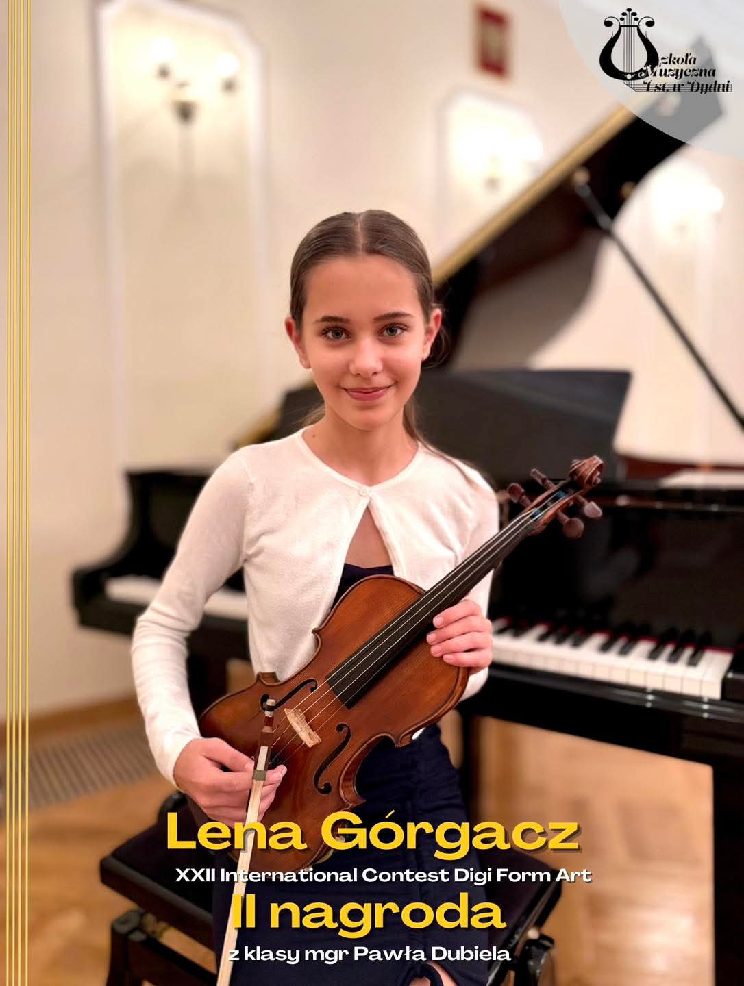 Duży sukces odniosła Lena Górgacz – uczennica klasy skrzypiec prowadzonej przez Pawła Dubiela. Młoda skrzypaczka zdobyła II nagrodę w międzynarodowym konkursie XXII International Contest DIGI-FORM-ART Winter 2026.