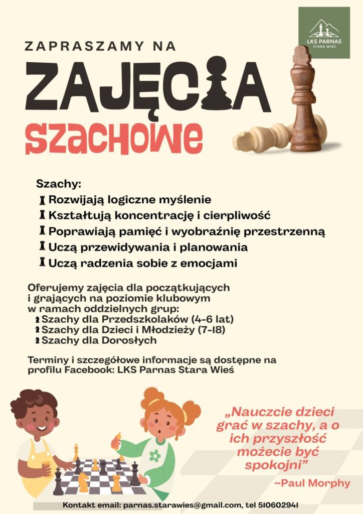 LKS PARNAS Stara Wieś zaprasza do świata królewskiej gry. Ruszają zapisy na zajęcia szachowe dla dzieci, młodzieży i dorosłych – zarówno początkujących, jak i graczy klubowych.