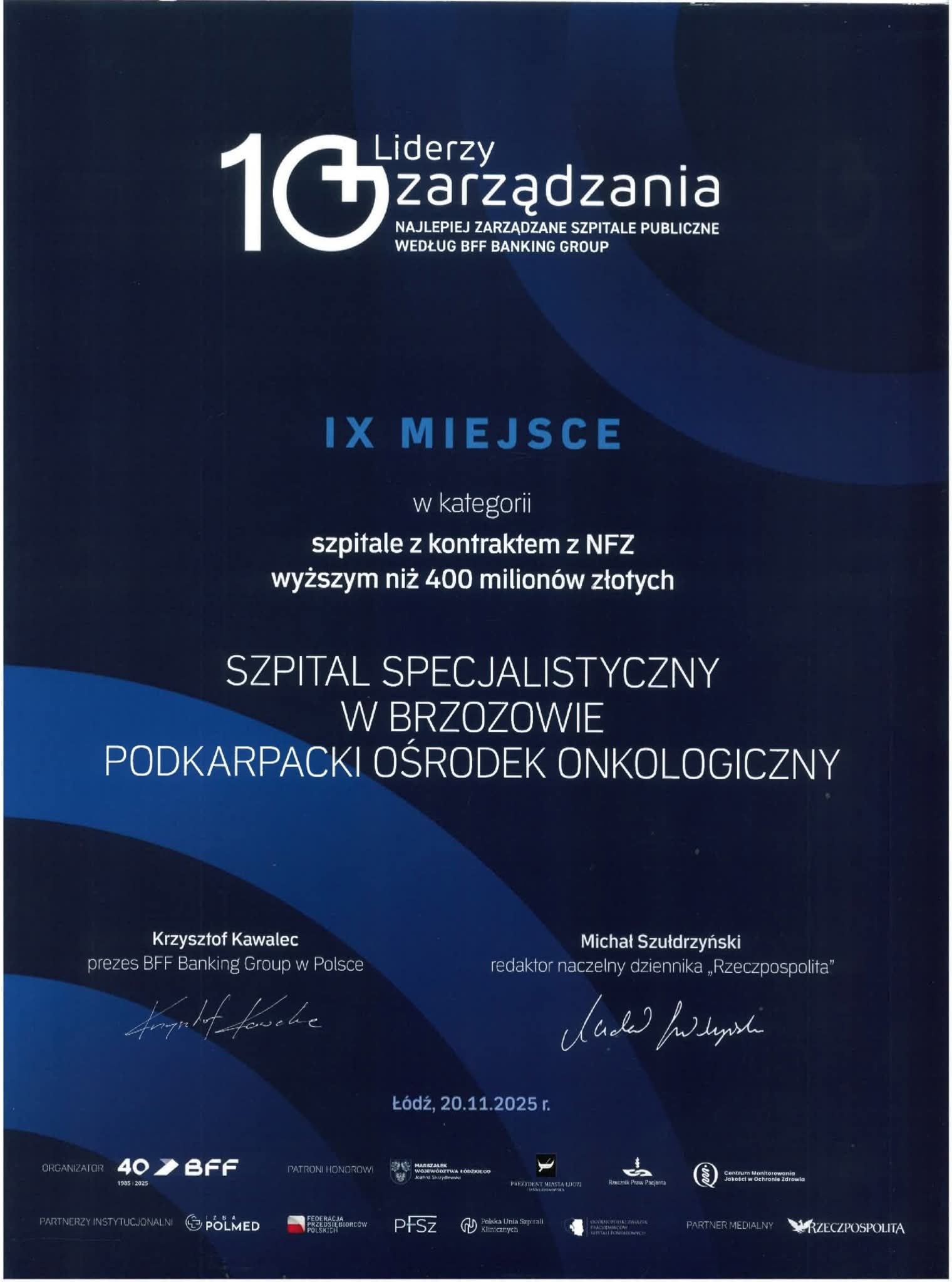 Szpital Specjalistyczny w Brzozowie Podkarpacki Ośrodek Onkologiczny im. ks. B. Markiewicza został wyróżniony w ogólnopolskim rankingu „Liderzy Zarządzania – najlepiej zarządzane szpitale publiczne”, organizowanym przez BFF Banking Group.