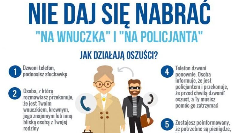 Oszustwa „na wnuczka” i „na policjanta”, to oszustwa, w których ofiarami są przeważnie osoby starsze. Metoda działania przestępców w takich przypadkach za każdym razem jest bardzo podobna. Oszuści najczęściej podają się za członka rodziny – wnuczka, córkę lub syna albo policjanta. W dalszej części rozmowy oszust informuje, że bliska osoba miała wypadek i potrzebuje pieniędzy w dużej kwocie.