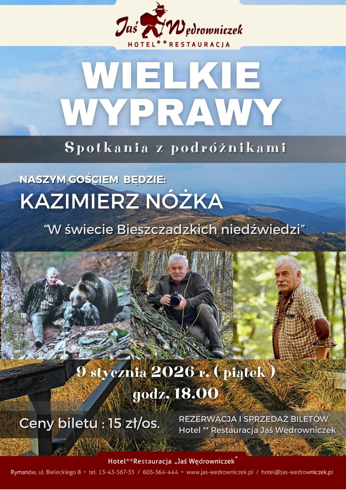 Już 9 stycznia 2026 roku o godz. 18.00 w Sali Bankietowej Hotelu–Restauracji Jaś Wędrowniczek w Rymanowie odbędzie się wyjątkowe spotkanie z cyklu Wielkie Wyprawy. Gościem specjalnym wydarzenia będzie Kazimierz Nóżka – znany leśnik, miłośnik przyrody i popularyzator wiedzy o dzikich zwierzętach.