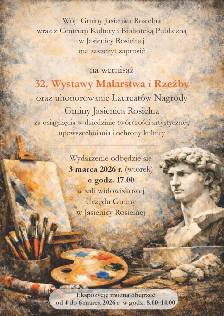 Wójt Gminy Jasienica Rosielna wraz z Centrum Kultury i Biblioteką Publiczną w Jasienicy Rosielnej zapraszają na wernisaż 32. Wystawy Malarstwa i Rzeźby połączony z uhonorowaniem Laureatów Nagrody Gminy Jasienica Rosielna za osiągnięcia w dziedzinie twórczości artystycznej, upowszechniania i ochrony kultury.