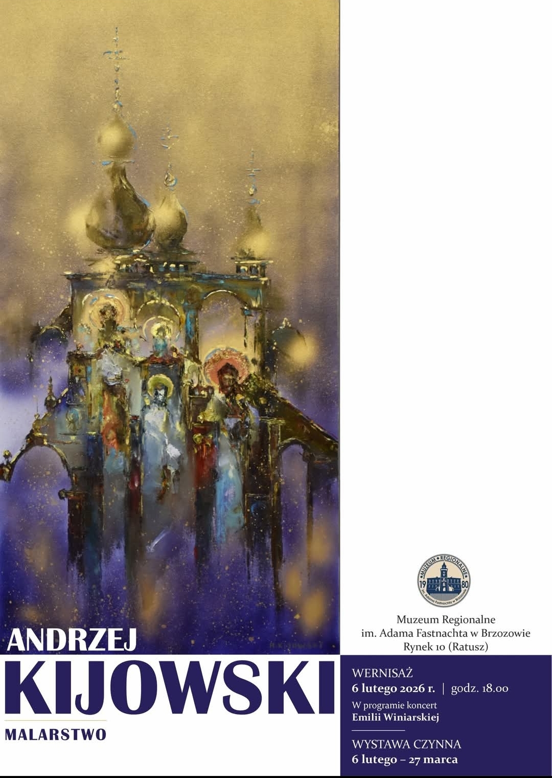 Muzeum Regionalne im. Adama Fastnachta w Brzozowie zaprasza na wernisaż wystawy malarstwa Andrzeja Kijowskiego, który odbędzie się 6 lutego 2026 roku o godz. 18.00 w siedzibie muzeum przy Rynku 10.