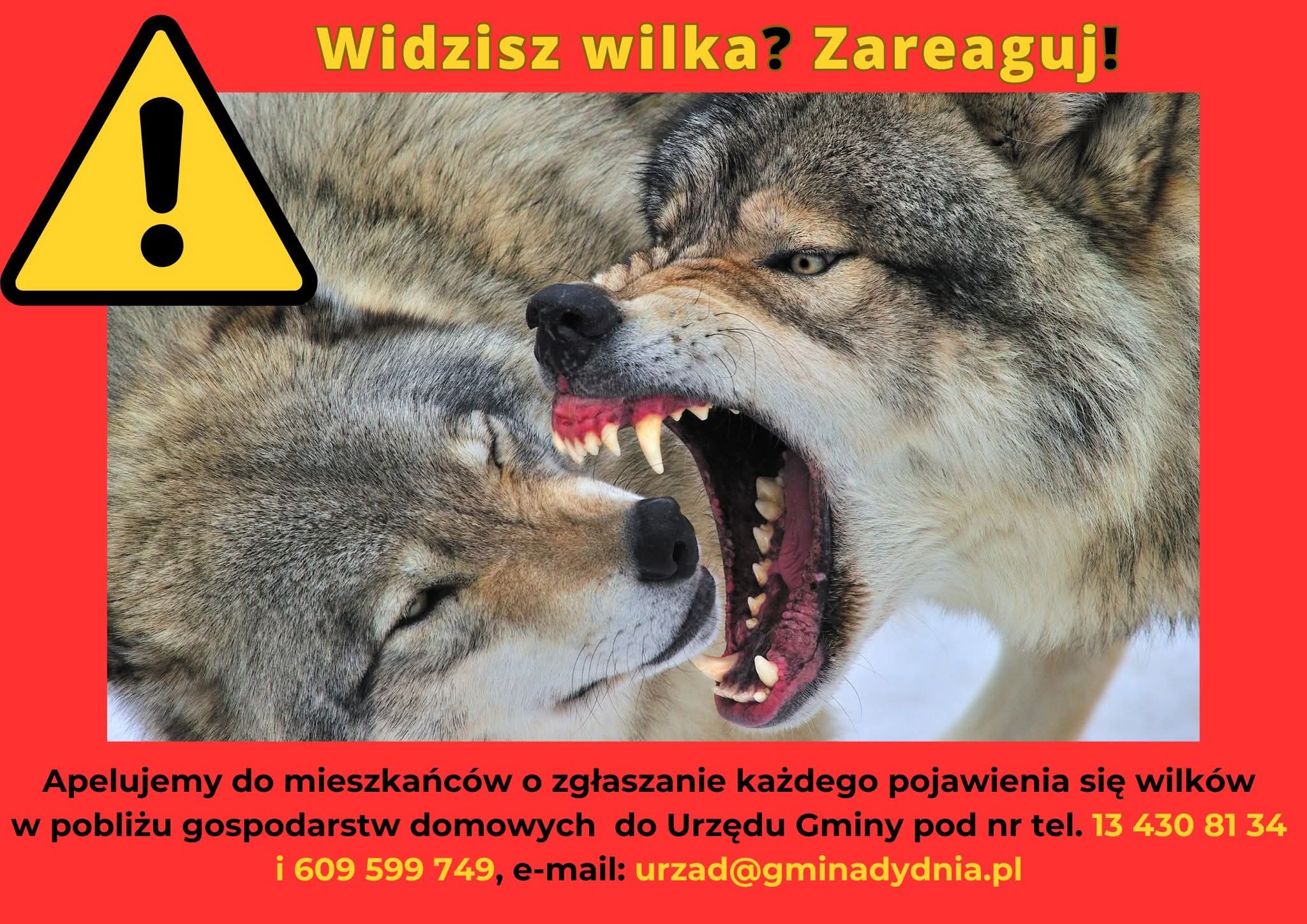 Każde zauważenie wilka należy zgłaszać do Urzędu Gminy w Dydni (pokój 104) telefonicznie pod numerami 13 430 81 34 lub 609 599 749, a także mailowo: [email protected]. Zebrane informacje posłużą do podjęcia dalszych działań mających na celu zwiększenie bezpieczeństwa mieszkańców.
