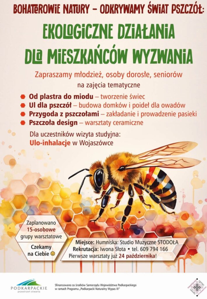 Organizatorzy zapraszają wszystkich – młodzież, dorosłych i seniorów – na wyjątkowe, bezpłatne warsztaty ekologiczne, które odbędą się w ramach projektu „Bohaterowie Natury – odkrywamy świat pszczół”. To doskonała okazja, by twórczo spędzić czas, nauczyć się czegoś nowego i zrobić coś dobrego dla przyrody!