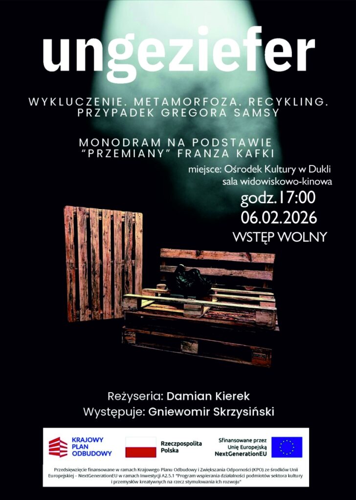 Ośrodek Kultury w Dukli zaprasza na poruszający monodram Ungeziefer. Przypadek Gregora Samsy – autorską inscenizację inspirowaną „Przemianą” Franza Kafki.