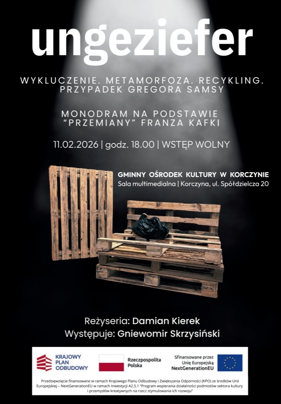 Czy „Przemiana” Franza Kafki może opowiedzieć coś nowego o współczesnym świecie? Twórcy monodramu „Ungeziefer. Przypadek Gregora Samsy” udowadniają, że tak — i to z wyjątkową siłą. Spektakl w reżyserii Damiana Kierka, z poruszającą rolą Gniewomira Skrzysińskiego, jest odważnym, aktualnym i niezwykle osobistym odczytaniem jednego z najważniejszych tekstów literatury XX wieku.