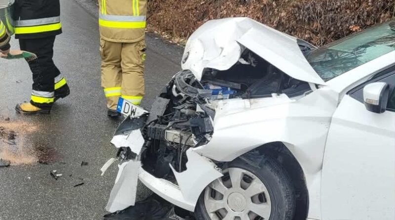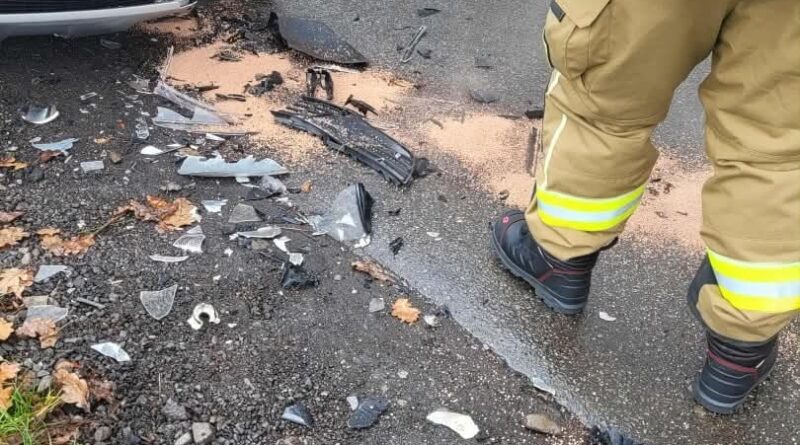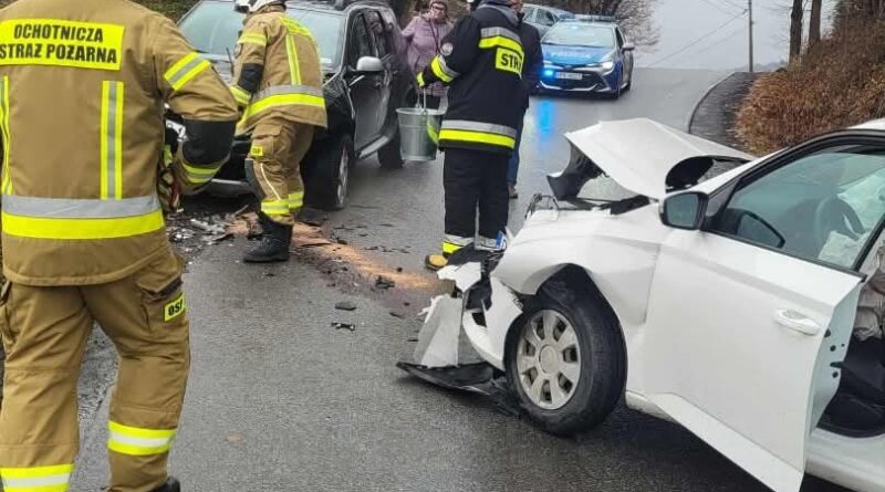 Na drodze gminnej doszło do zderzenia dwóch samochodów osobowych. Ze wstępnych ustaleń wynika, że jedna z osób kierujących prawdopodobnie nie zachowała należytej ostrożności, co doprowadziło do zjechania na przeciwny pas ruchu i zderzenia czołowego z autem nadjeżdżającym z naprzeciwka.